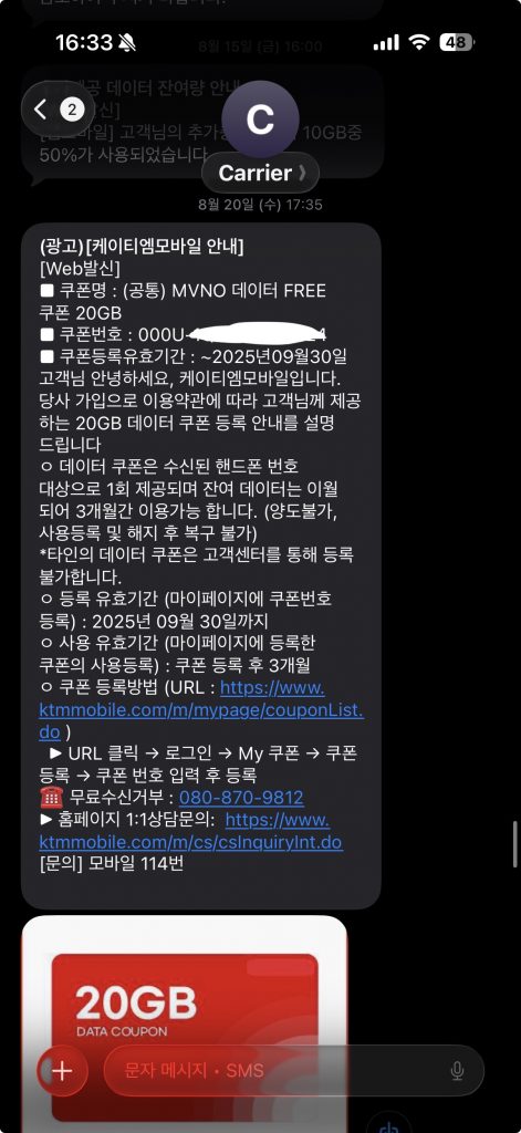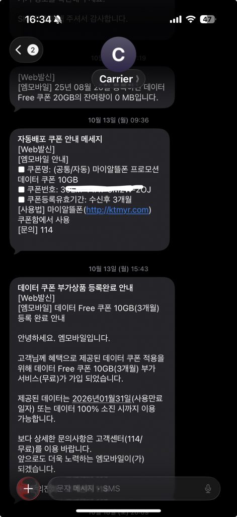 또한 데이터 쿠폰을 굉장히 많이 뿌리는데, 이정도면 그냥 퍼주는 게 아닐까 정도로 많이 뿌린다. 보통 3개월간 10GB를 사용할 수 있는 쿠폰을 뿌리는데, 글쓴이도 거의 2달에 한 번씩 받는 것 같다.