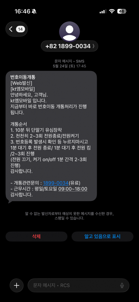 유심을 배송받은 후에 통신사 측에서 전화가 오는데,그 전화를 받고 이것저것 알려드리면 개통 처리가 완료된다(사실 글쓴이가 아니라 부모님께 전화가 가서 자세한 과정은 모른다). 번호이동의 경우 전화를 받은 후에 아래 메시지가 오고, SKT 회선이 해지되며 서비스 불가 상태로 변경되었다.