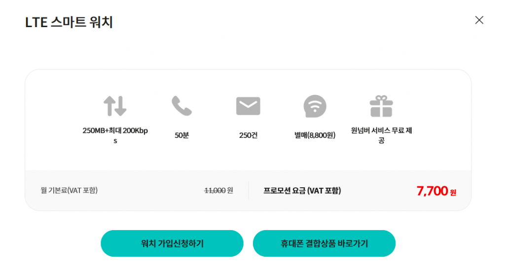 월 7,700원에 원넘버 서비스에 단독 통화 50분 + 문자 250건, 데이터 250MB의 스마트워치 전용 요금제를 제공한다. 글쓴이도 조만간 가입할 예정.